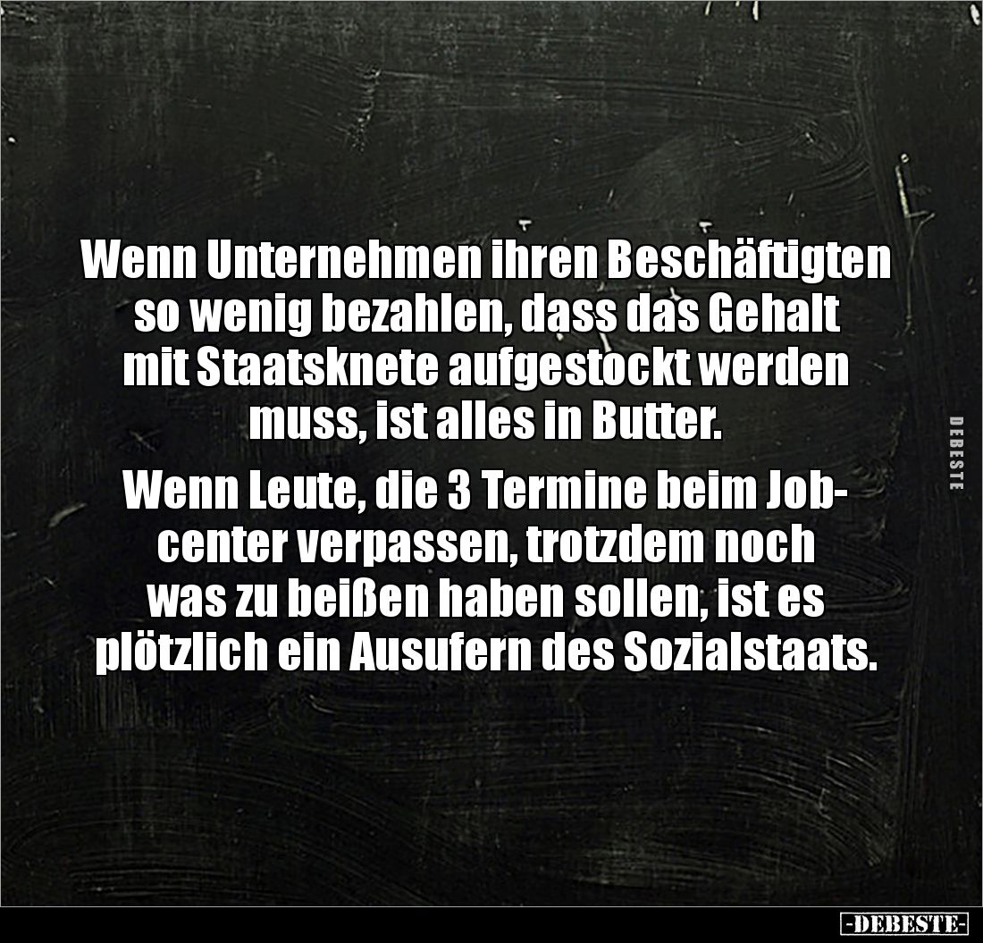 Wenn Unternehmen ihren Beschäftigten so wenig bezahlen, dass das Gehalt mit Staatsknete aufgestockt werden muss, ist alles in Butter. Wenn Leute, die 3 Termine beim Job- center verpassen, trotzdem noch was zu beißen haben sollen, ist es plötzlich ein Ausufern des Sozialstaats.