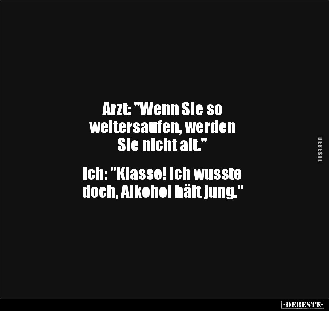 Arzt: "Wenn Sie so weitersaufen, werden Sie nicht alt." Ich: "Klasse! Ich wusste doch, Alkohol hält jung."