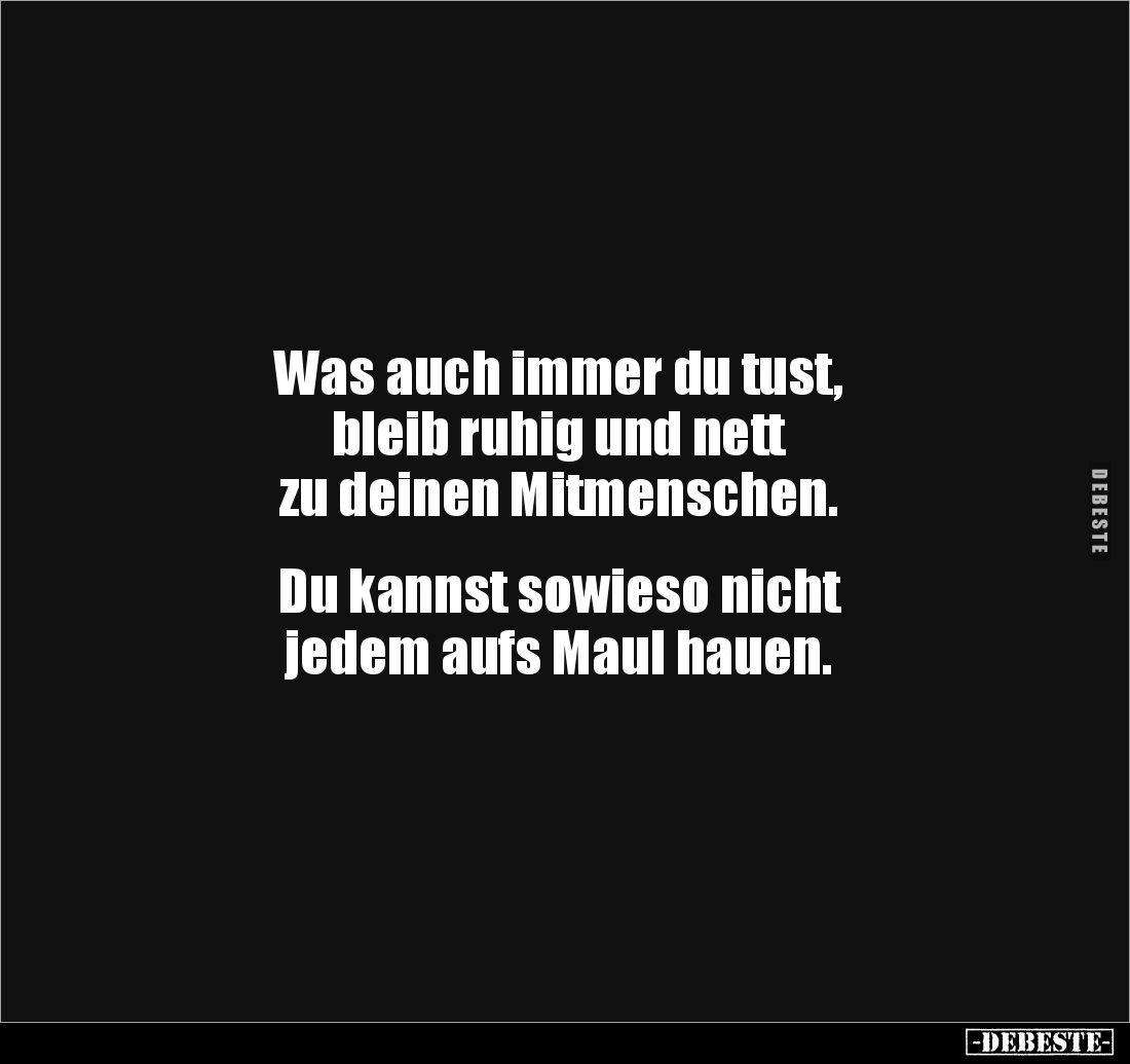 Was auch immer du tust, bleib ruhig und nett zu deinen Mitmenschen. Du kannst sowieso nicht jedem aufs Maul hauen.