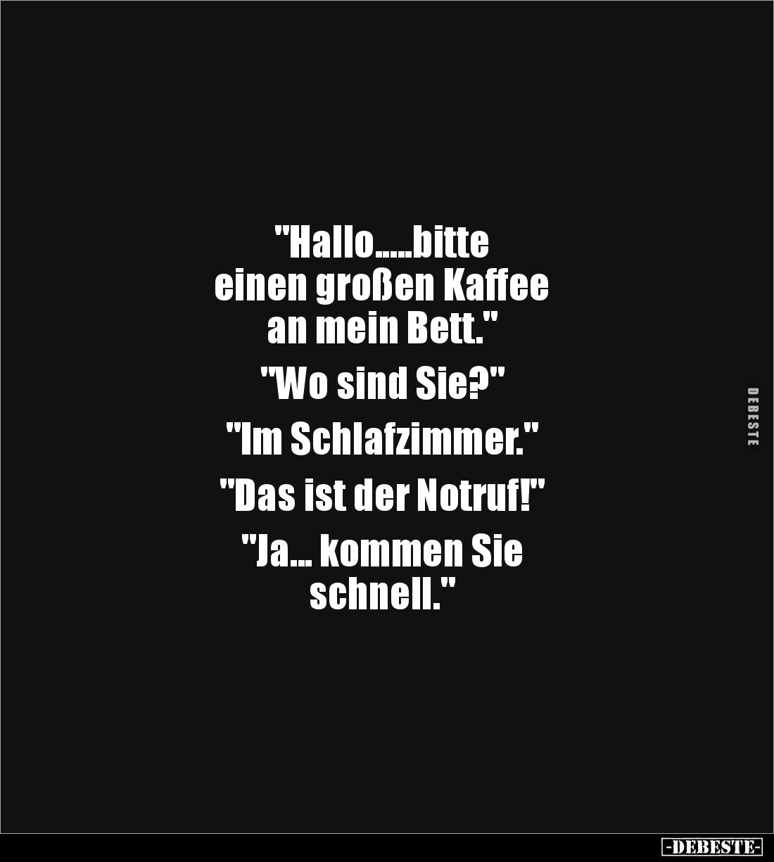 "Hallo.....bitte einen großen Kaffee an mein Bett." "Wo sind Sie?" "Im Schlafzimmer." "Das ist der Notruf!" "Ja... kommen Sie schnell."