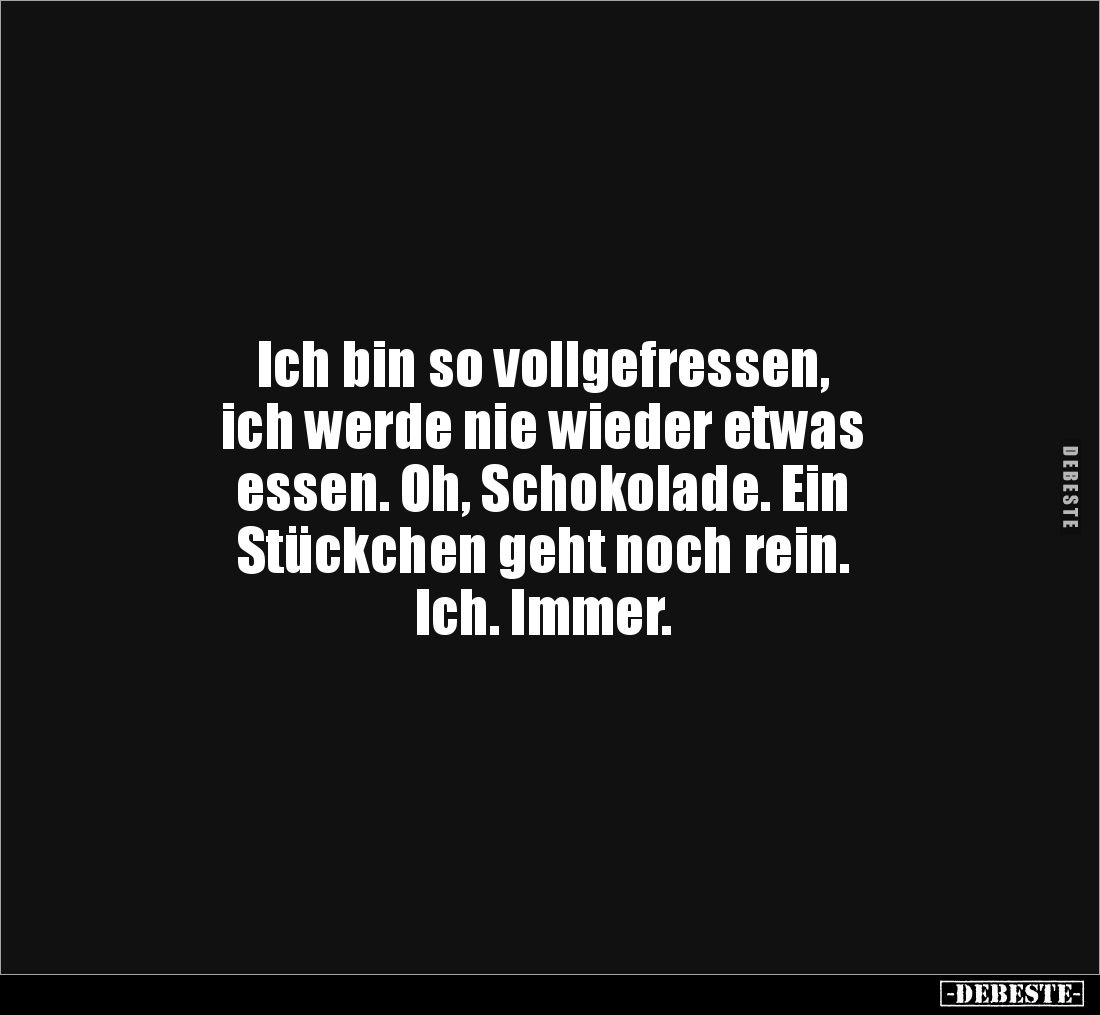 Ich bin so vollgefressen, ich werde nie wieder etwas essen. Oh, Schokolade. Ein Stückchen geht noch rein. Ich. Immer.