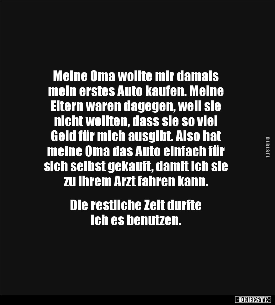Meine Oma wollte mir damals mein erstes Auto kaufen. Meine Eltern waren dagegen, weil sie nicht wollten, dass sie so viel Geld für mich ausgibt. Also hat meine Oma das Auto einfach für sich selbst gekauft, damit ich sie zu ihrem Arzt fahren kann. Die restliche Zeit durfte ich es benutzen.