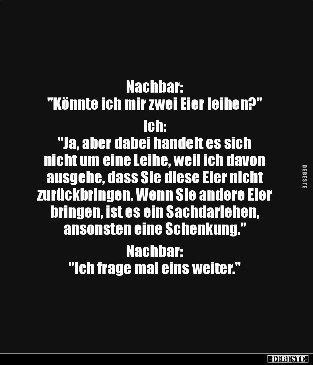 Nachbar: "Könnte ich mir zwei Eier leihen?" Ich: "Ja, aber dabei handelt es sich nicht um eine Leihe, weil ich davon ausgehe, dass Sie diese Eier nicht zurückbringen. Wenn Sie andere Eier bringen, ist es ein Sachdarlehen, ansonsten eine Schenkung." Nachbar: "Ich frage mal eins weiter."