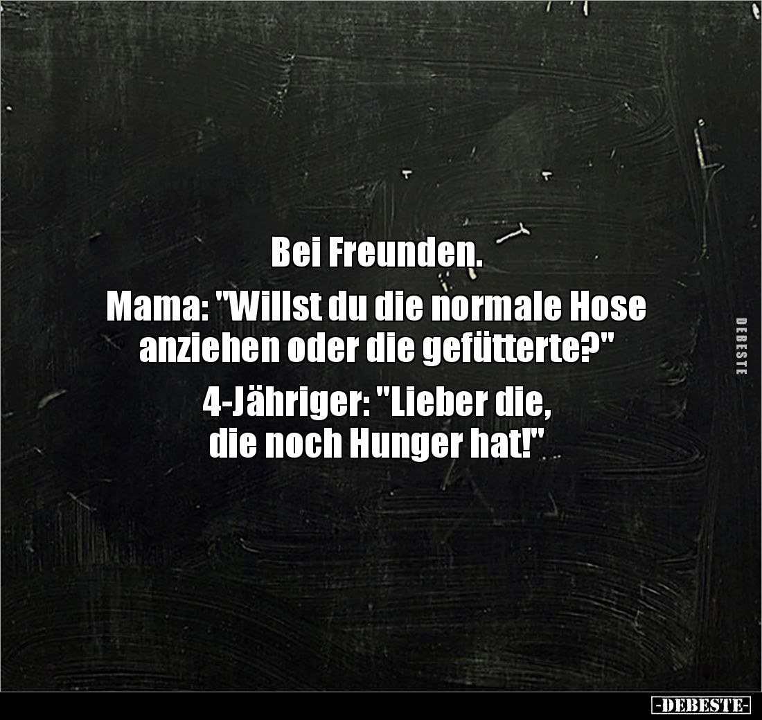 Bei Freunden. Mama: "Willst du die normale Hose anziehen oder die gefütterte?" 4-Jähriger: "Lieber die, die noch Hunger hat!"