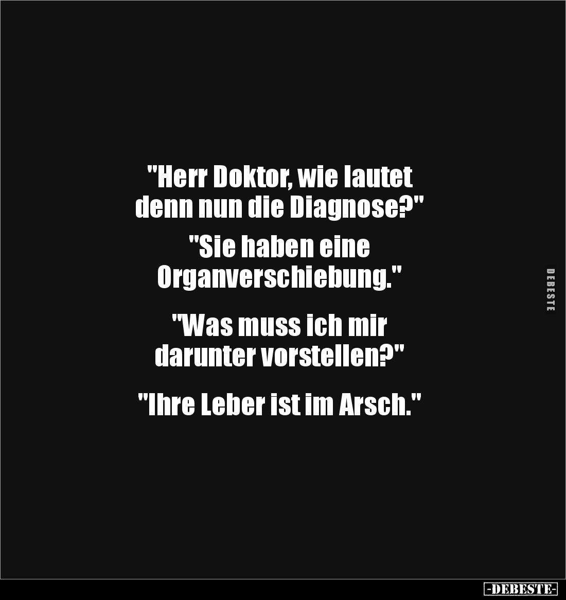 "Herr Doktor, wie lautet denn nun die Diagnose?" "Sie haben eine Organverschiebung." "Was muss ich mir darunter vorstellen?" "Ihre Leber ist im Arsch."