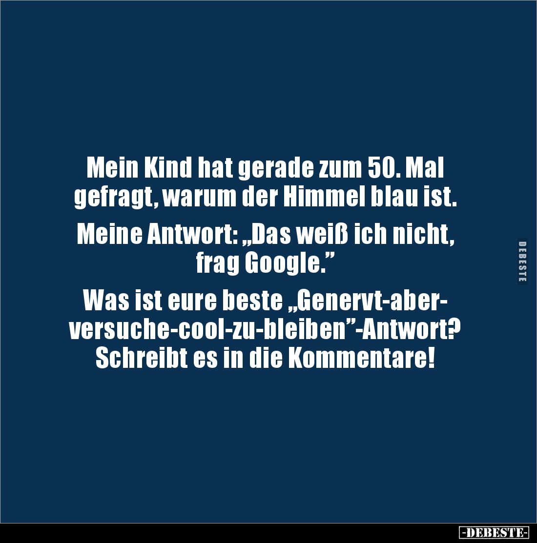 Mein Kind hat gerade zum 50. Mal gefragt, warum der Himmel blau ist. Meine Antwort: „Das weiß ich nicht, frag Google.” Was ist eure beste „Genervt-aber- versuche-cool-zu-bleiben”-Antwort? Schreibt es in die Kommentare!