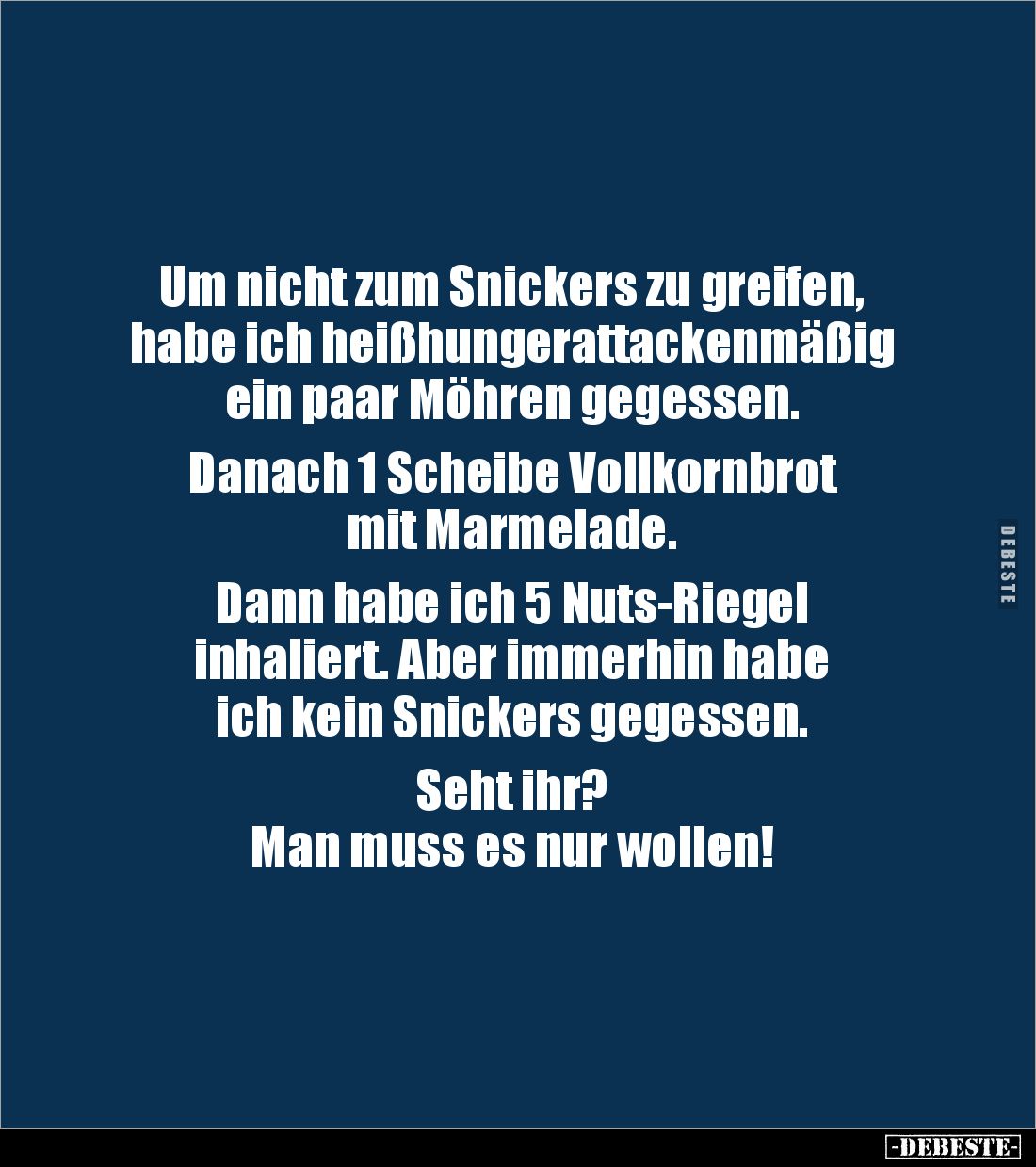 Um nicht zum Snickers zu greifen, habe ich heißhungerattackenmäßig ein paar Möhren gegessen. Danach 1 Scheibe Vollkornbrot mit Marmelade. Dann habe ich 5 Nuts-Riegel inhaliert. Aber immerhin habe ich kein Snickers gegessen. Seht ihr? Man muss es nur wollen!