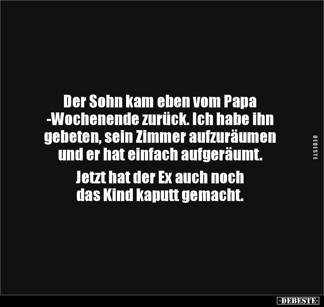 Der Sohn kam eben vom Papa -Wochenende zurück. Ich habe ihn gebeten, sein Zimmer aufzuräumen und er hat einfach aufgeräumt. Jetzt hat der Ex auch noch das Kind kaputt gemacht.