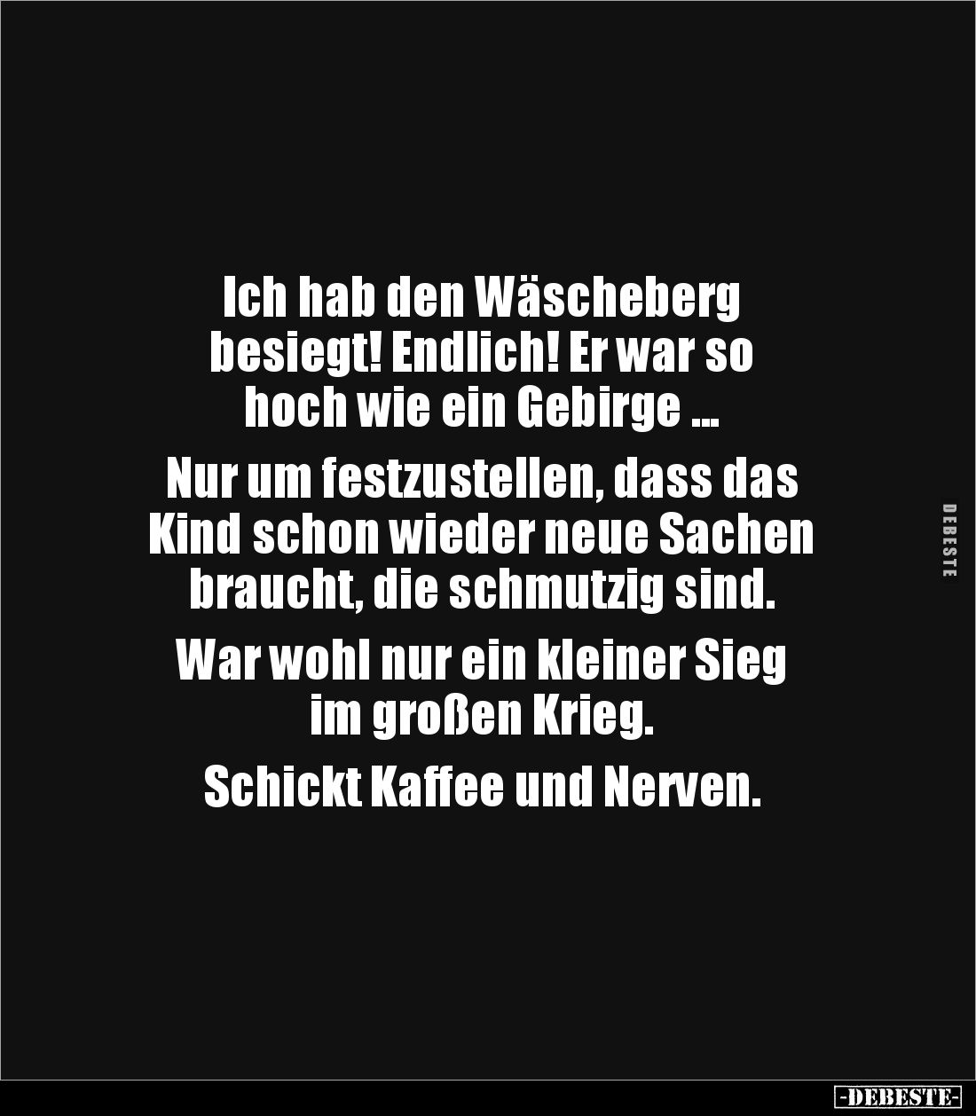 Ich hab den Wäscheberg besiegt! Endlich! Er war so hoch wie ein Gebirge ... Nur um festzustellen, dass das Kind schon wieder neue Sachen braucht, die schmutzig sind. War wohl nur ein kleiner Sieg im großen Krieg. Schickt Kaffee und Nerven.