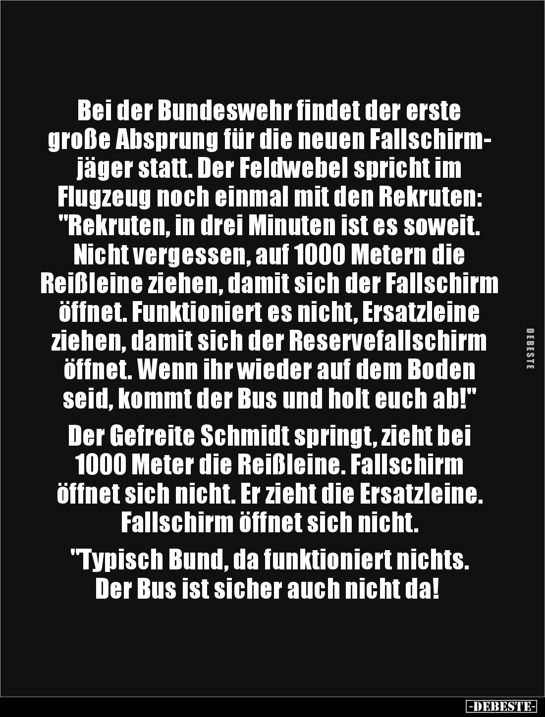 Bei der Bundeswehr findet der erste große Absprung für die neuen Fallschirm- jäger statt. Der Feldwebel spricht im Flugzeug noch einmal mit den Rekruten: "Rekruten, in drei Minuten ist es soweit. Nicht vergessen, auf 1000 Metern die Reißleine ziehen, damit sich der Fallschirm öffnet. Funktioniert es nicht, Ersatzleine ziehen, damit sich der Reservefallschirm öffnet. Wenn ihr wieder auf dem Boden seid, kommt der Bus und holt euch ab!" Der Gefreite Schmidt springt, zieht bei 1000 Meter die Reißleine. Fallschirm öffnet sich nicht. Er zieht die Ersatzleine. Fallschirm öffnet sich nicht. "Typisch Bund, da funktioniert nichts. Der Bus ist sicher auch nicht da!