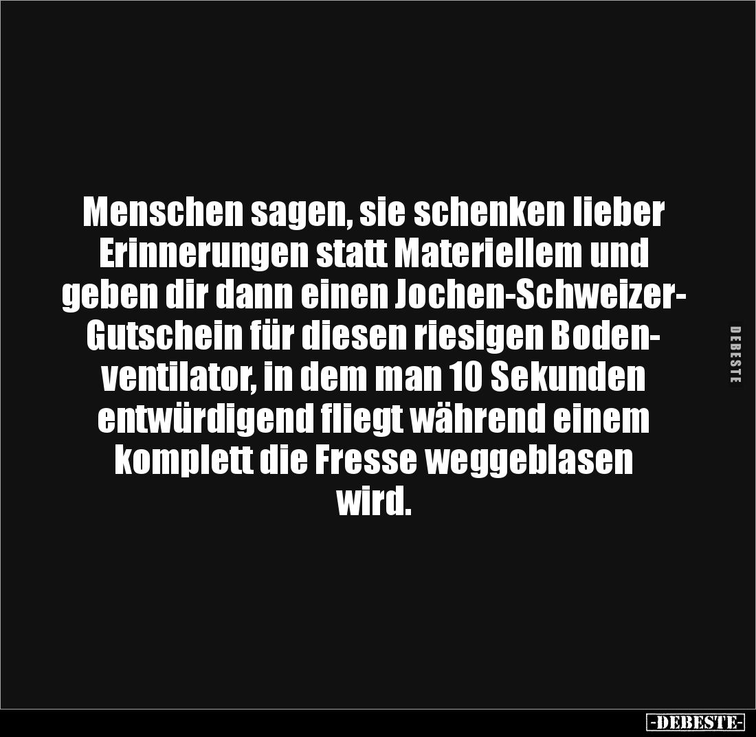 Menschen sagen, sie schenken lieber Erinnerungen statt Materiellem und geben dir dann einen Jochen-Schweizer- Gutschein für diesen riesigen Boden- ventilator, in dem man 10 Sekunden entwürdigend fliegt während einem komplett die Fresse weggeblasen wird.
