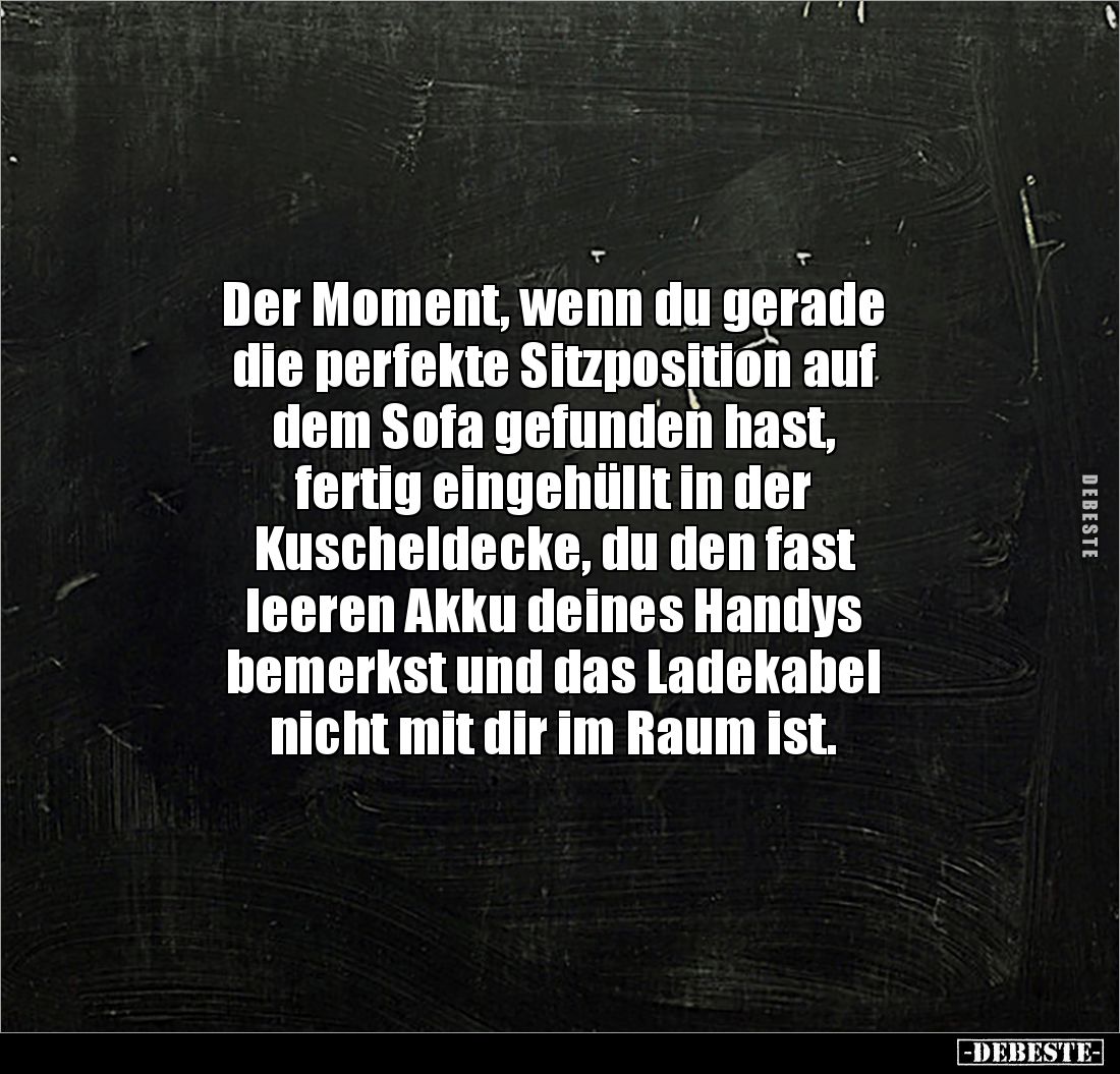 Der Moment, wenn du gerade die perfekte Sitzposition auf dem Sofa gefunden hast, fertig eingehüllt in der Kuscheldecke, du den fast leeren Akku deines Handys bemerkst und das Ladekabel nicht mit dir im Raum ist.