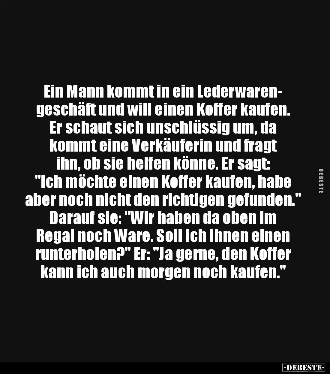Ein Mann kommt in ein Lederwaren- geschäft und will einen Koffer kaufen. Er schaut sich unschlüssig um, da kommt eine Verkäuferin und fragt ihn, ob sie helfen könne. Er sagt: "Ich möchte einen Koffer kaufen, habe aber noch nicht den richtigen gefunden." Darauf sie: "Wir haben da oben im Regal noch Ware. Soll ich Ihnen einen runterholen?" Er: "Ja gerne, den Koffer kann ich auch morgen noch kaufen."
