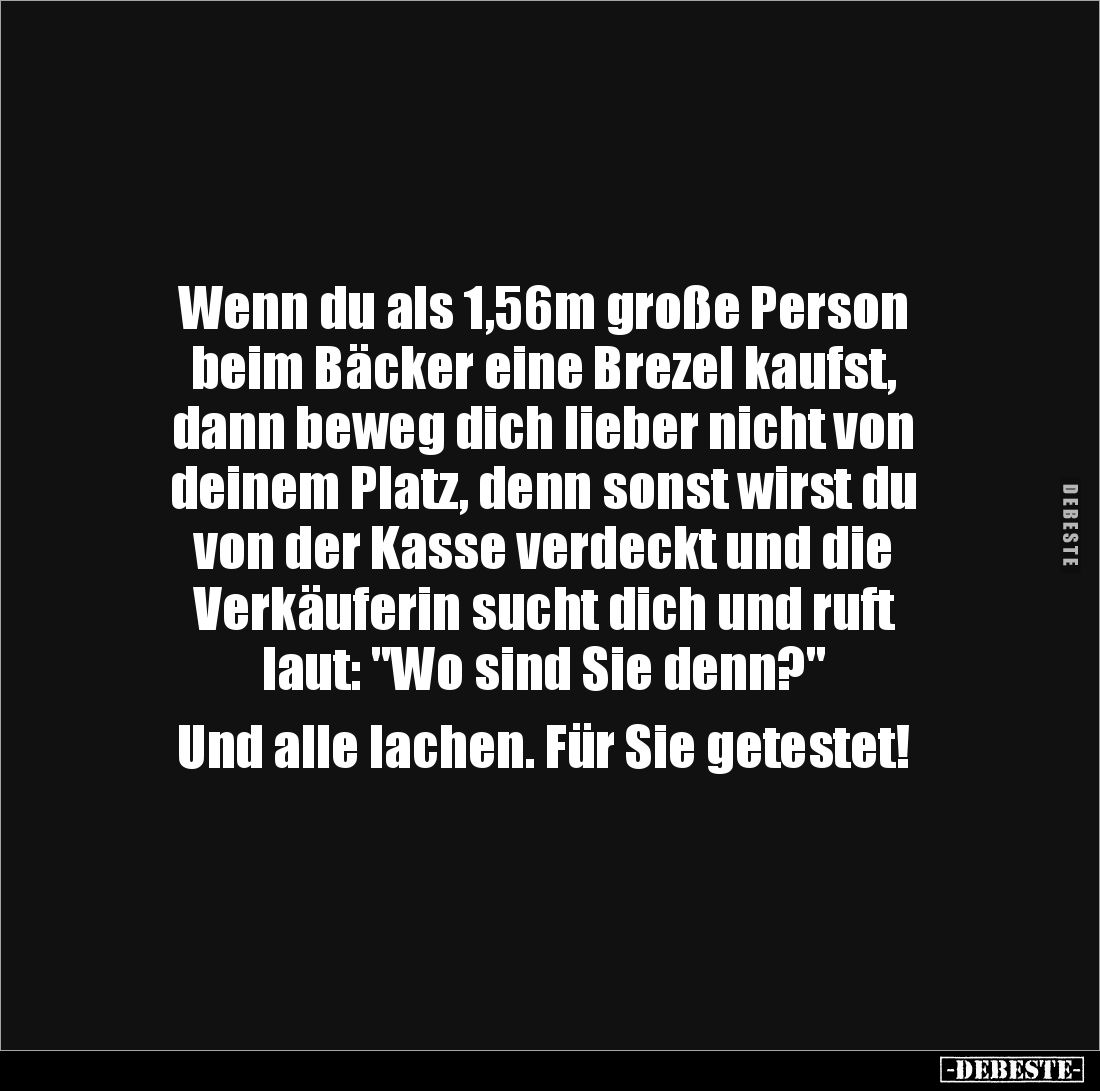 Wenn du als 1,56m große Person beim Bäcker eine Brezel kaufst, dann beweg dich lieber nicht von deinem Platz, denn sonst wirst du von der Kasse verdeckt und die Verkäuferin sucht dich und ruft laut: "Wo sind Sie denn?" Und alle lachen. Für Sie getestet!