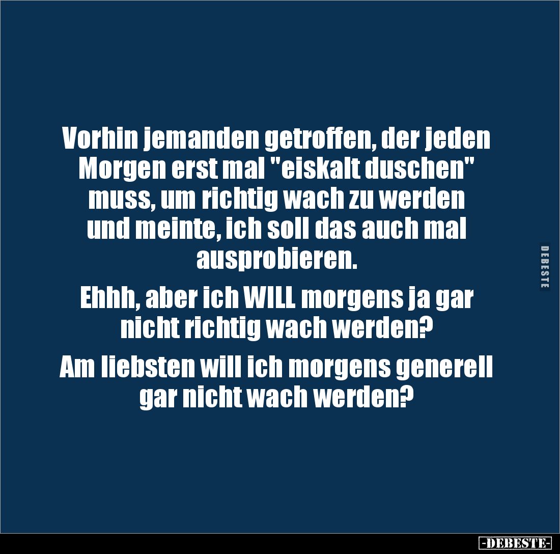 Vorhin jemanden getroffen, der jeden Morgen erst mal "eiskalt duschen" muss, um richtig wach zu werden und meinte, ich soll das auch mal ausprobieren. Ehhh, aber ich WILL morgens ja gar nicht richtig wach werden? Am liebsten will ich morgens generell gar nicht wach werden?