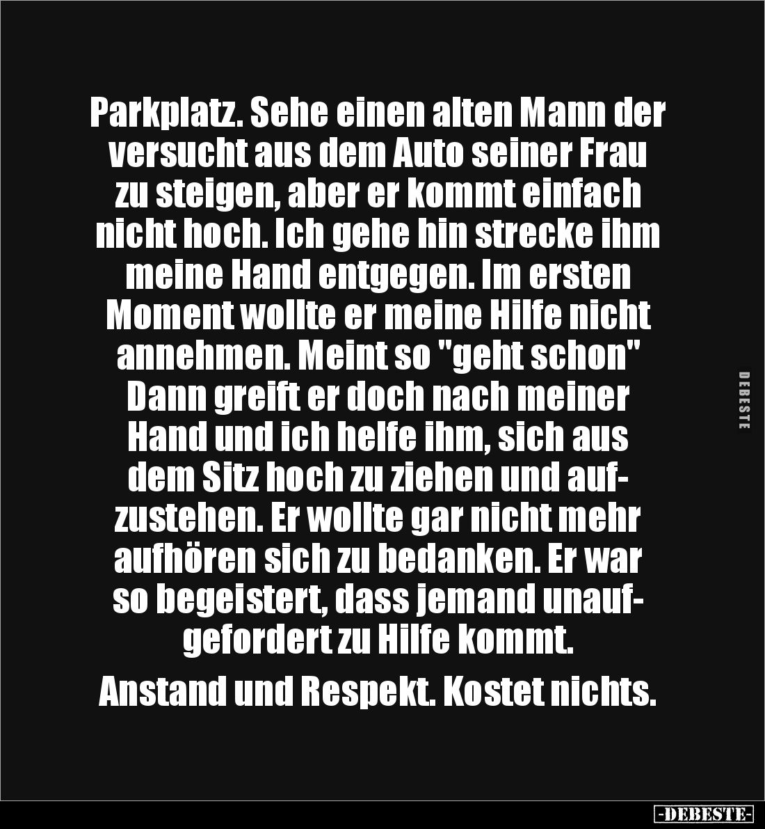 Parkplatz. Sehe einen alten Mann der versucht aus dem Auto seiner Frau zu steigen, aber er kommt einfach nicht hoch. Ich gehe hin strecke ihm meine Hand entgegen. Im ersten Moment wollte er meine Hilfe nicht annehmen. Meint so "geht schon" Dann greift er doch nach meiner Hand und ich helfe ihm, sich aus dem Sitz hoch zu ziehen und auf- zustehen. Er wollte gar nicht mehr aufhören sich zu bedanken. Er war so begeistert, dass jemand unauf- gefordert zu Hilfe kommt. Anstand und Respekt. Kostet nichts.