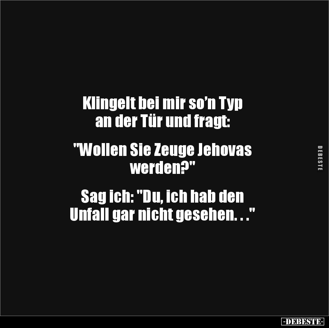 Klingelt bei mir so’n Typ an der Tür und fragt: "Wollen Sie Zeuge Jehovas werden?" Sag ich: "Du, ich hab den Unfall gar nicht gesehen. . ."