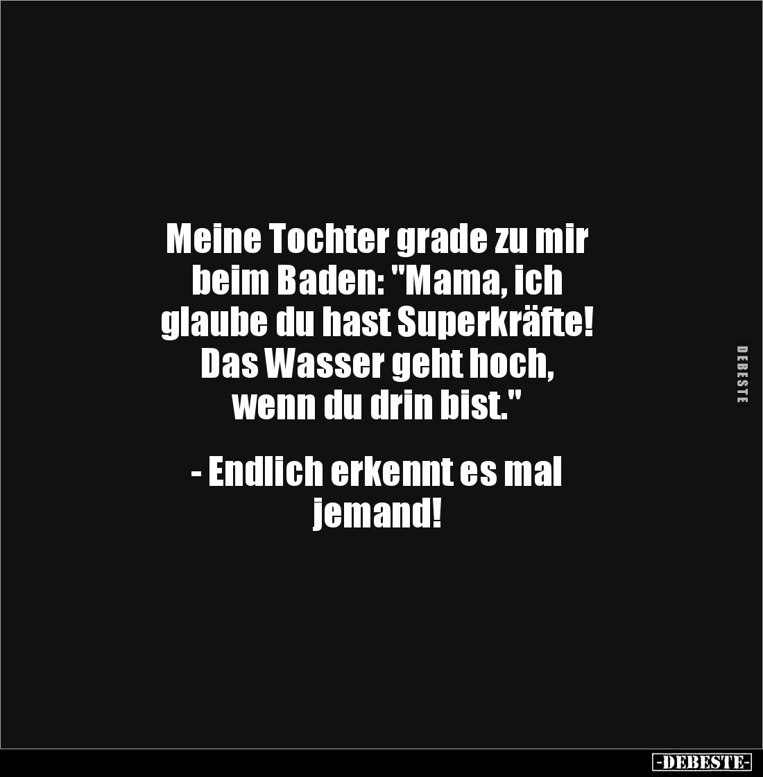 Meine Tochter grade zu mir beim Baden: "Mama, ich glaube du hast Superkräfte! Das Wasser geht hoch, wenn du drin bist." - Endlich erkennt es mal jemand!