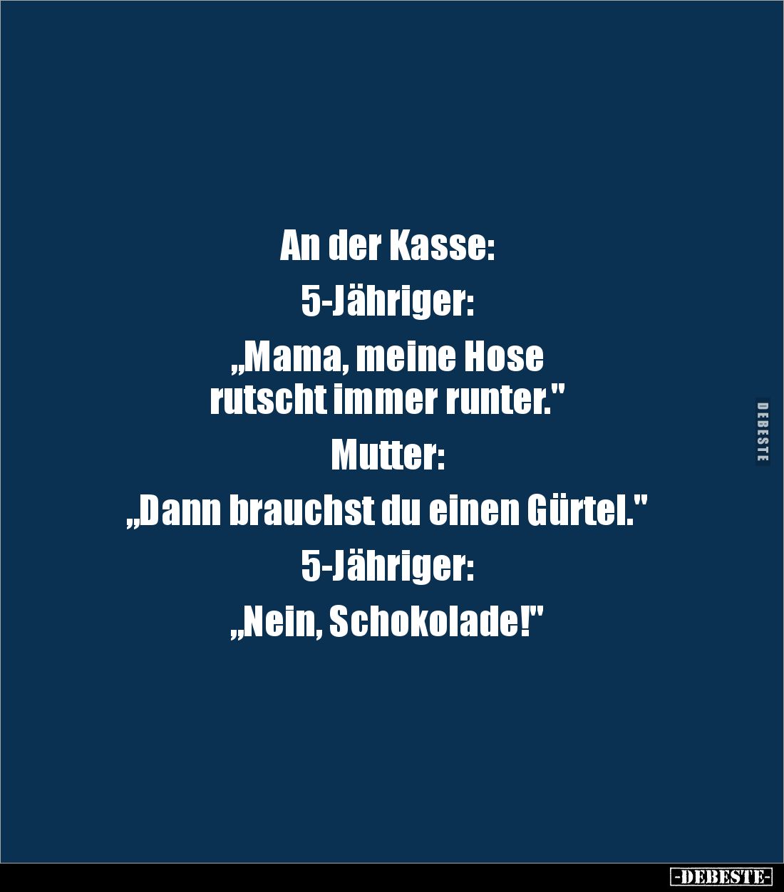 An der Kasse: 5-Jähriger: „Mama, meine Hose rutscht immer runter." Mutter: „Dann brauchst du einen Gürtel." 5-Jähriger: „Nein, Schokolade!"
