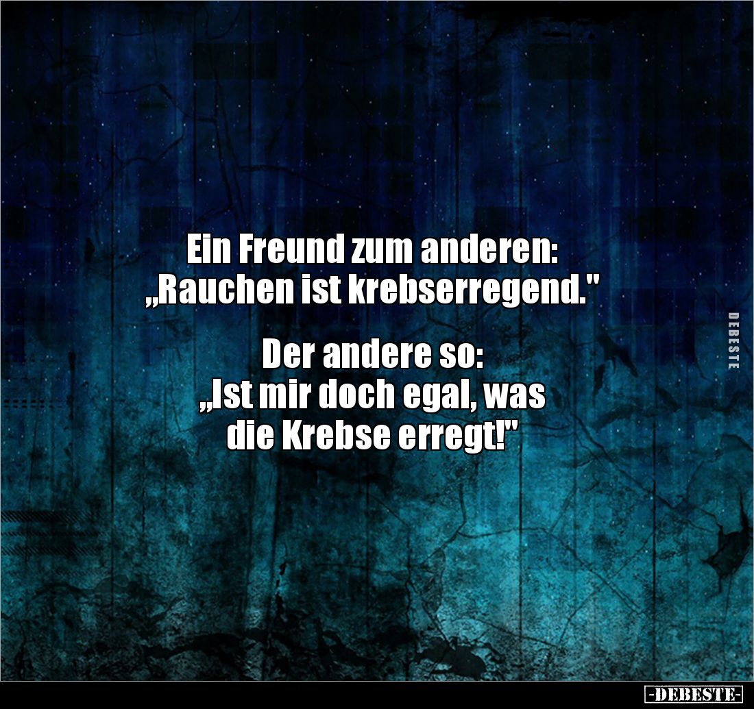 Ein Freund zum anderen: „Rauchen ist krebserregend." Der andere so: „Ist mir doch egal, was die Krebse erregt!"