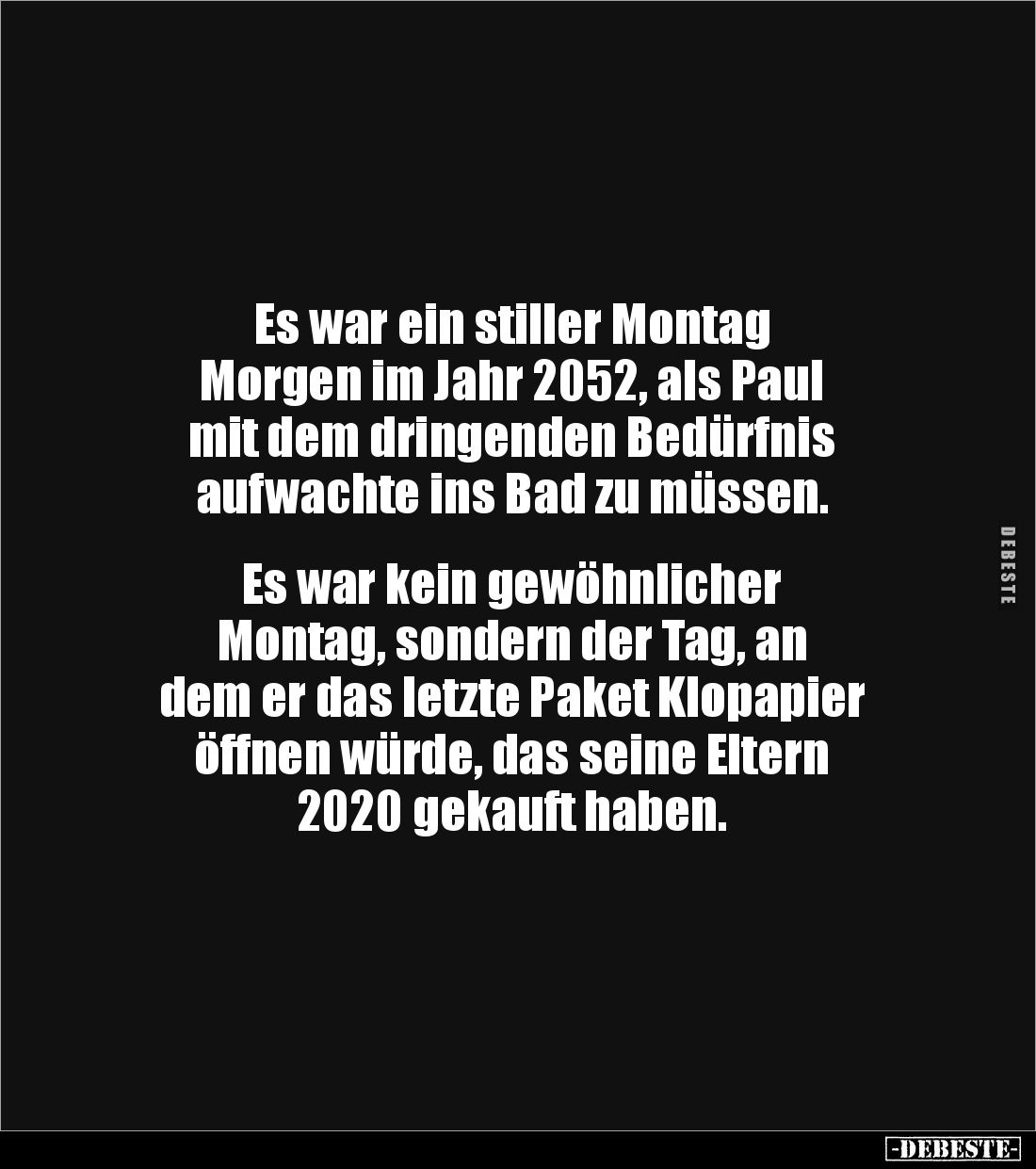 Es war ein stiller Montag Morgen im Jahr 2052, als Paul mit dem dringenden Bedürfnis aufwachte ins Bad zu müssen. Es war kein gewöhnlicher Montag, sondern der Tag, an dem er das letzte Paket Klopapier öffnen würde, das seine Eltern 2020 gekauft haben.