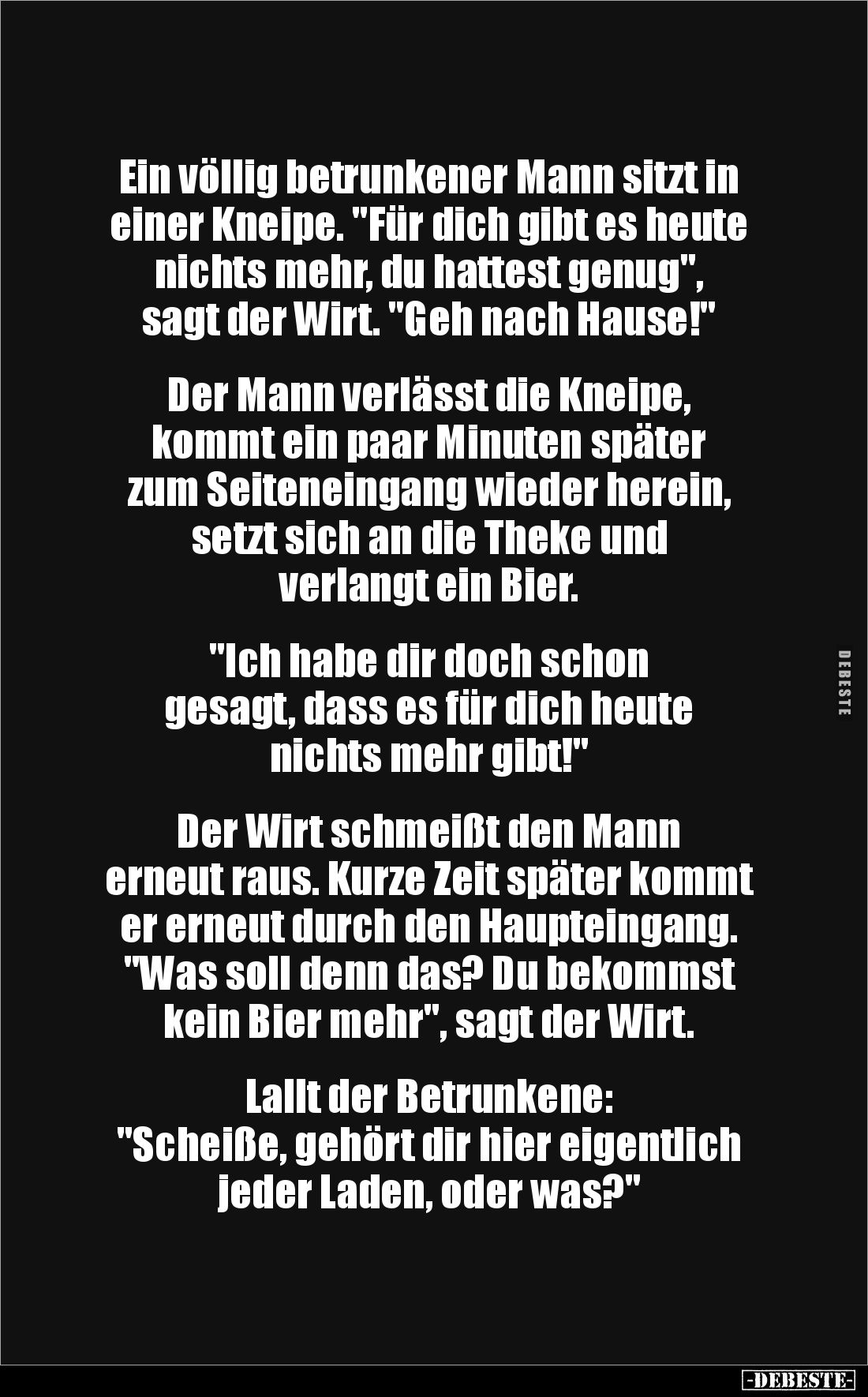 Ein völlig betrunkener Mann sitzt in einer Kneipe. "Für dich gibt es heute nichts mehr, du hattest genug", sagt der Wirt. "Geh nach Hause!" Der Mann verlässt die Kneipe, kommt ein paar Minuten später zum Seiteneingang wieder herein, setzt sich an die Theke und verlangt ein Bier. "Ich habe dir doch schon gesagt, dass es für dich heute nichts mehr gibt!" Der Wirt schmeißt den Mann erneut raus. Kurze Zeit später kommt er erneut durch den Haupteingang. "Was soll denn das? Du bekommst kein Bier mehr", sagt der Wirt. Lallt der Betrunkene: "Scheiße, gehört dir hier eigentlich jeder Laden, oder was?"