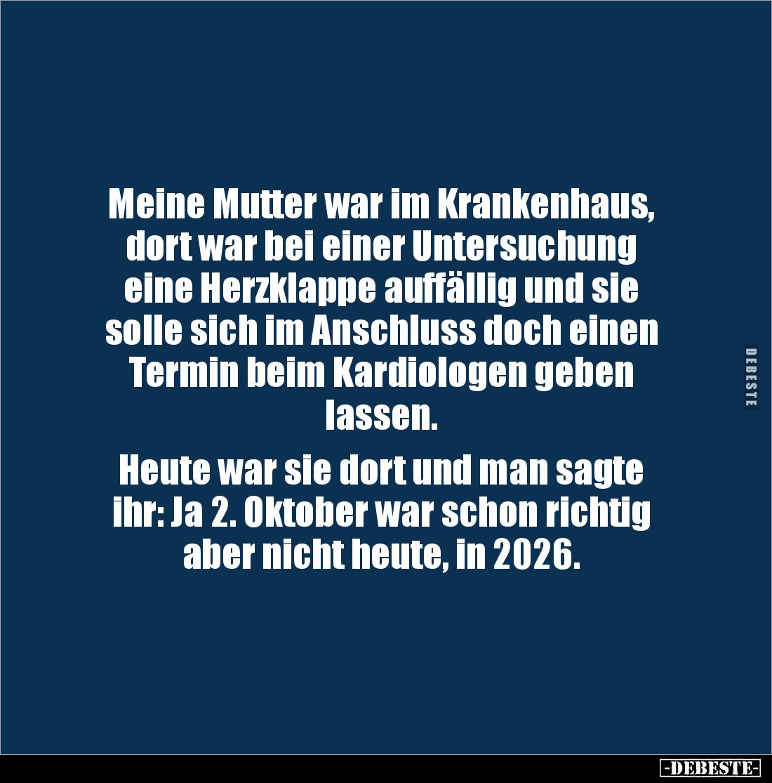 Meine Mutter war im Krankenhaus, dort war bei einer Untersuchung eine Herzklappe auffällig und sie solle sich im Anschluss doch einen Termin beim Kardiologen geben lassen. Heute war sie dort und man sagte ihr: Ja 2. Oktober war schon richtig aber nicht heute, in 2026.