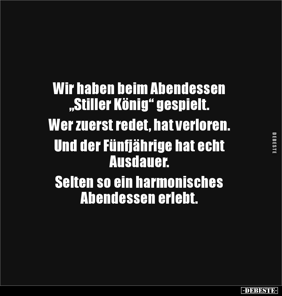 Wir haben beim Abendessen „Stiller König“ gespielt. Wer zuerst redet, hat verloren. Und der Fünfjährige hat echt Ausdauer. Selten so ein harmonisches Abendessen erlebt.