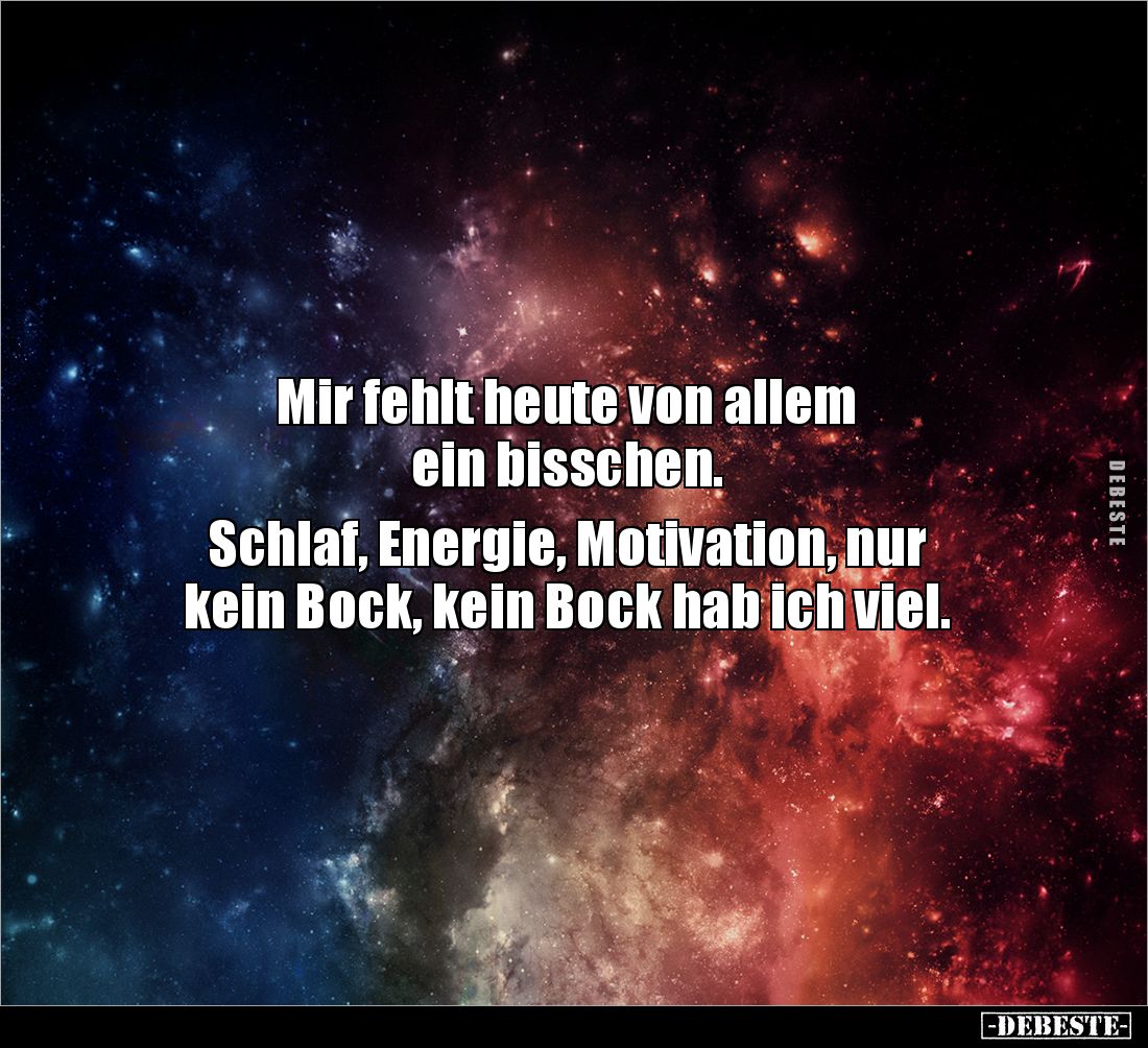 Mir fehlt heute von allem ein bisschen. Schlaf, Energie, Motivation, nur kein Bock, kein Bock hab ich viel.