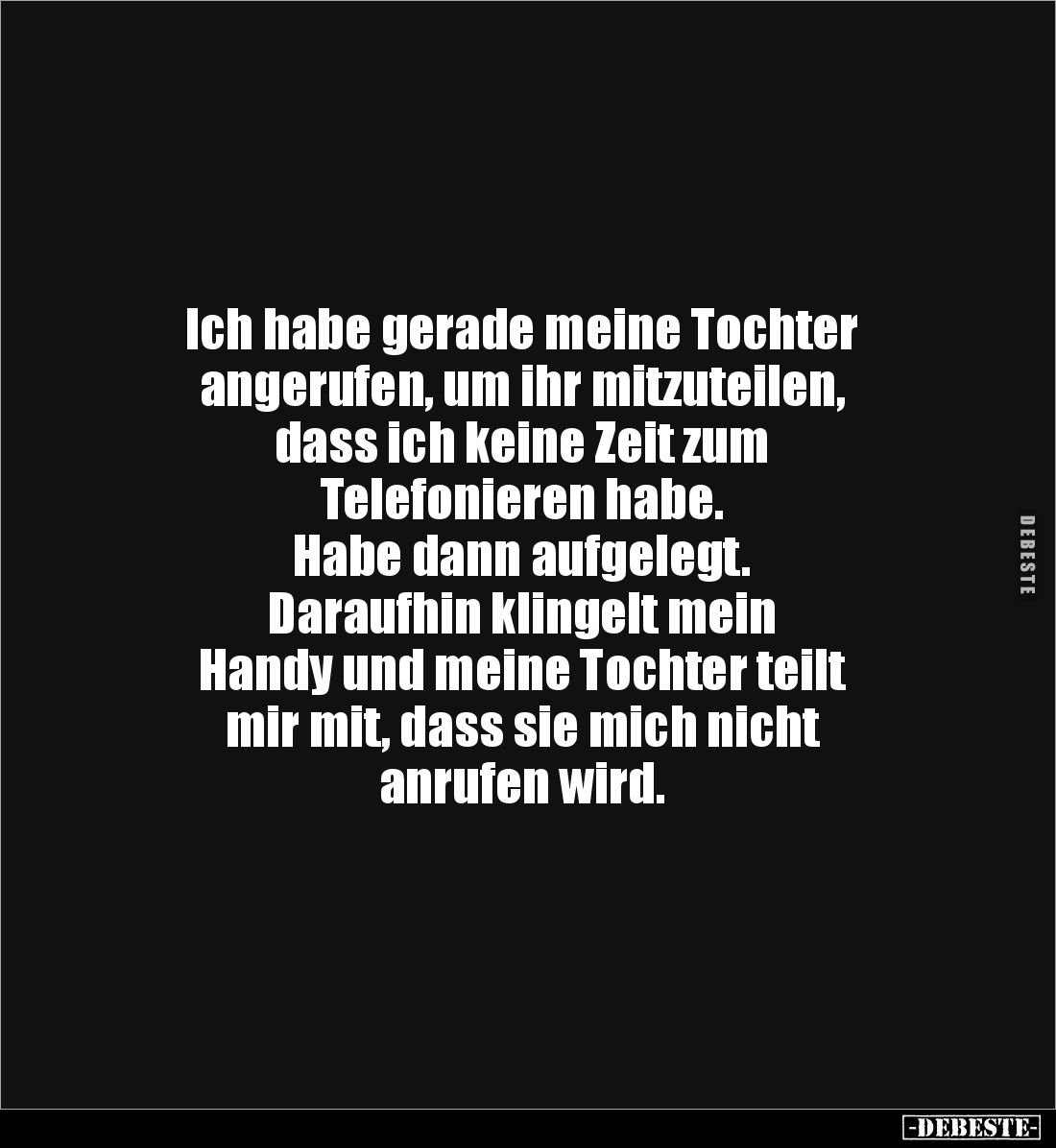Ich habe gerade meine Tochter angerufen, um ihr mitzuteilen, dass ich keine Zeit zum Telefonieren habe. Habe dann aufgelegt. Daraufhin klingelt mein Handy und meine Tochter teilt mir mit, dass sie mich nicht anrufen wird.