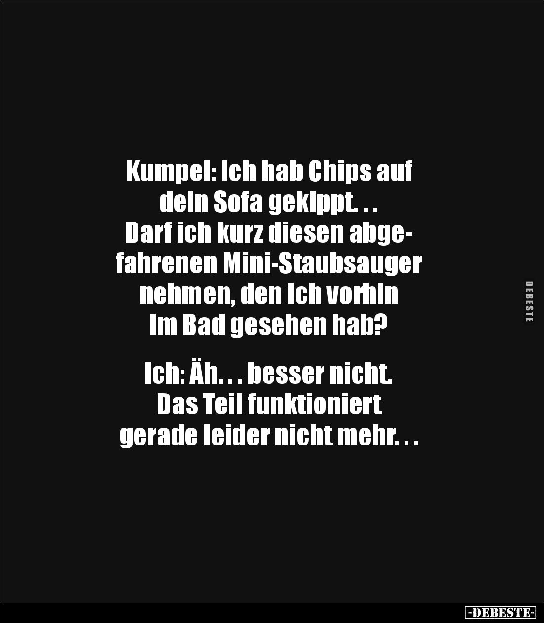 Kumpel: Ich hab Chips auf dein Sofa gekippt. . . Darf ich kurz diesen abge- fahrenen Mini-Staubsauger nehmen, den ich vorhin im Bad gesehen hab? Ich: Äh. . . besser nicht. Das Teil funktioniert gerade leider nicht mehr. . .
