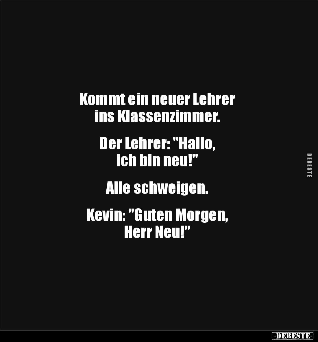 Kommt ein neuer Lehrer ins Klassenzimmer. Der Lehrer: "Hallo, ich bin neu!" Alle schweigen. Kevin: "Guten Morgen, Herr Neu!"