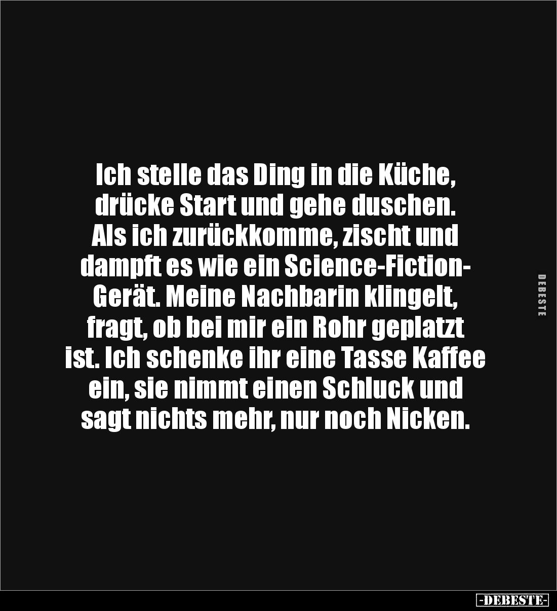 Ich stelle das Ding in die Küche, drücke Start und gehe duschen. Als ich zurückkomme, zischt und dampft es wie ein Science-Fiction- Gerät. Meine Nachbarin klingelt, fragt, ob bei mir ein Rohr geplatzt ist. Ich schenke ihr eine Tasse Kaffee ein, sie nimmt einen Schluck und sagt nichts mehr, nur noch Nicken.