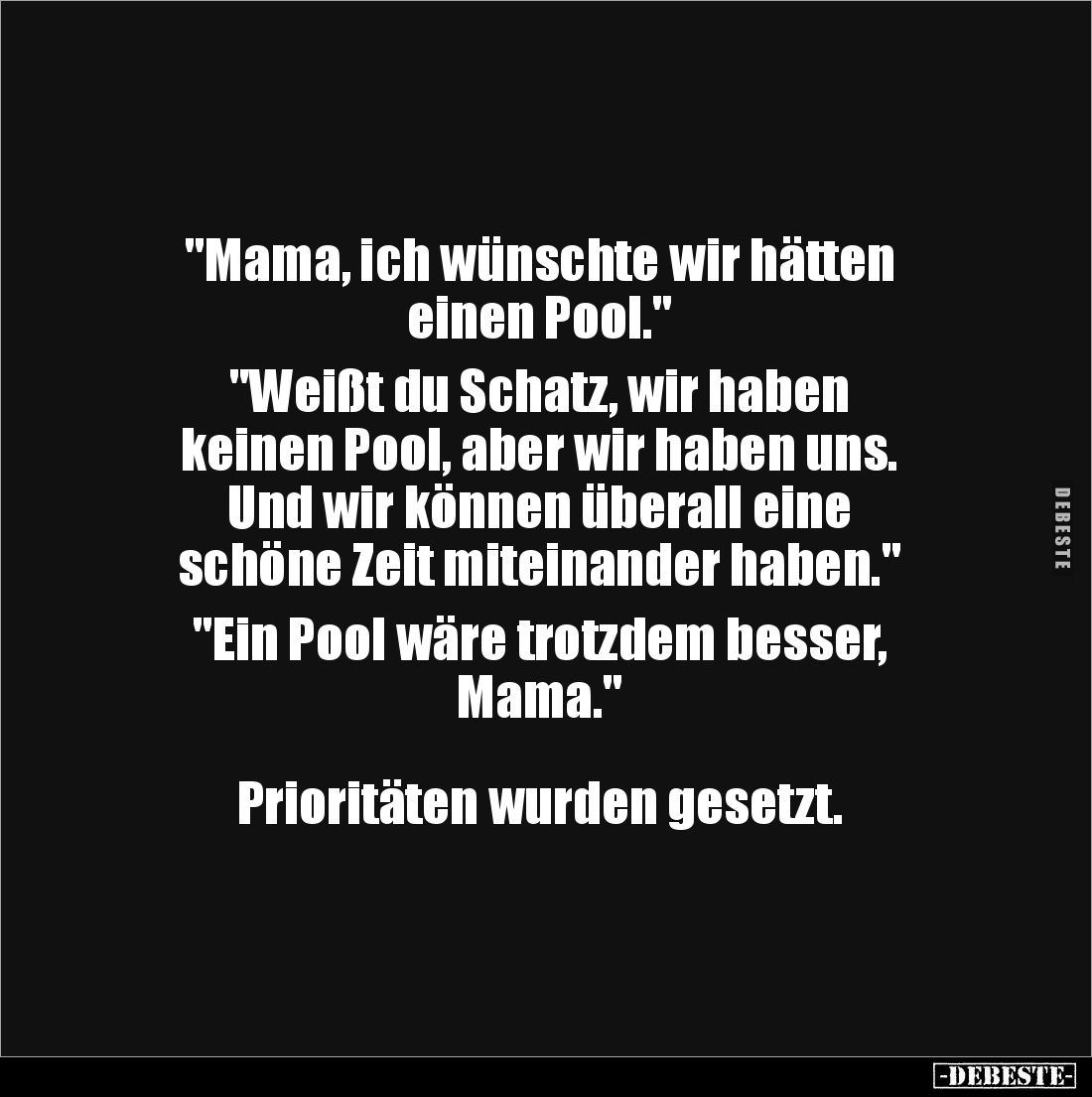 "Mama, ich wünschte wir hätten einen Pool." "Weißt du Schatz, wir haben keinen Pool, aber wir haben uns. Und wir können überall eine schöne Zeit miteinander haben." "Ein Pool wäre trotzdem besser, Mama." Prioritäten wurden gesetzt.