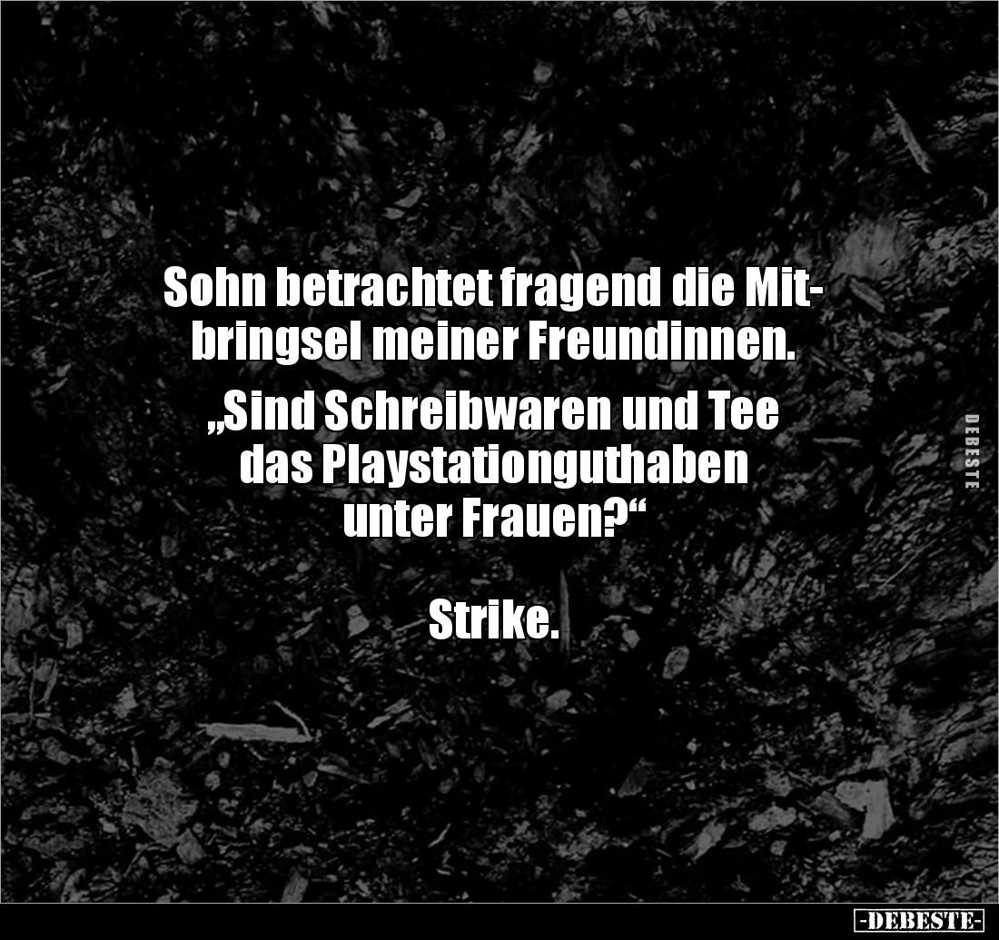 Sohn betrachtet fragend die Mit- bringsel meiner Freundinnen. „Sind Schreibwaren und Tee das Playstationguthaben unter Frauen?“ Strike.