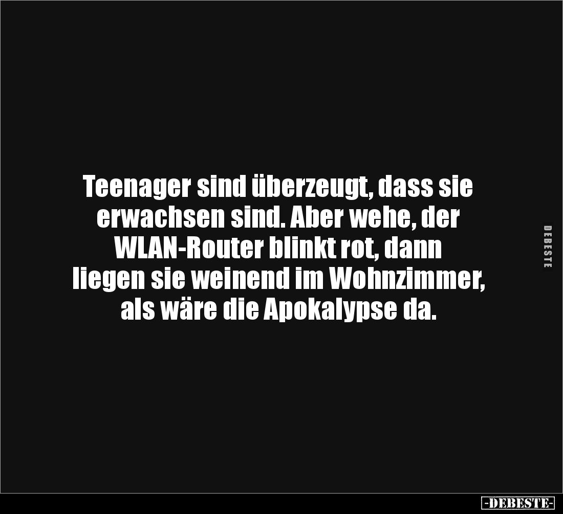 Teenager sind überzeugt, dass sie erwachsen sind. Aber wehe, der WLAN-Router blinkt rot, dann liegen sie weinend im Wohnzimmer, als wäre die Apokalypse da.