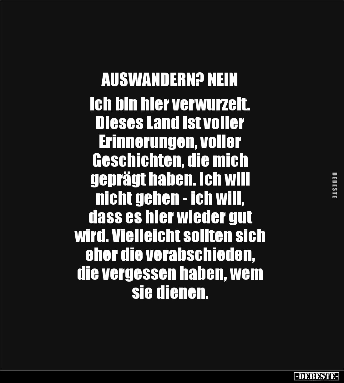 AUSWANDERN? NEIN Ich bin hier verwurzelt. Dieses Land ist voller Erinnerungen, voller Geschichten, die mich geprägt haben. Ich will nicht gehen - ich will, dass es hier wieder gut wird. Vielleicht sollten sich eher die verabschieden, die vergessen haben, wem sie dienen.