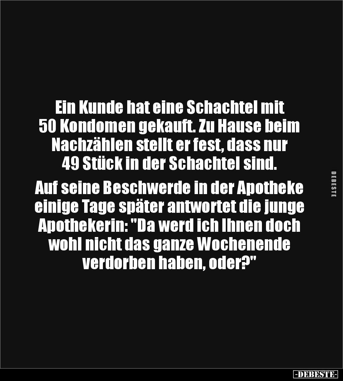 Ein Kunde hat eine Schachtel mit 50 Kondomen gekauft. Zu Hause beim Nachzählen stellt er fest, dass nur 49 Stück in der Schachtel sind. Auf seine Beschwerde in der Apotheke einige Tage später antwortet die junge Apothekerin: "Da werd ich Ihnen doch wohl nicht das ganze Wochenende verdorben haben, oder?"
