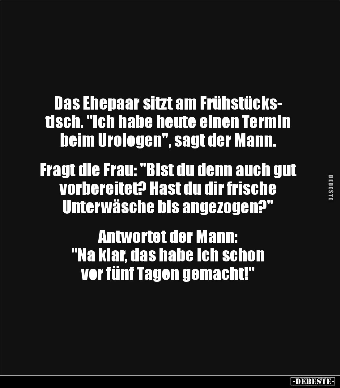Das Ehepaar sitzt am Frühstücks- tisch. "Ich habe heute einen Termin beim Urologen", sagt der Mann. Fragt die Frau: "Bist du denn auch gut vorbereitet? Hast du dir frische Unterwäsche bis angezogen?" Antwortet der Mann: "Na klar, das habe ich schon vor fünf Tagen gemacht!"