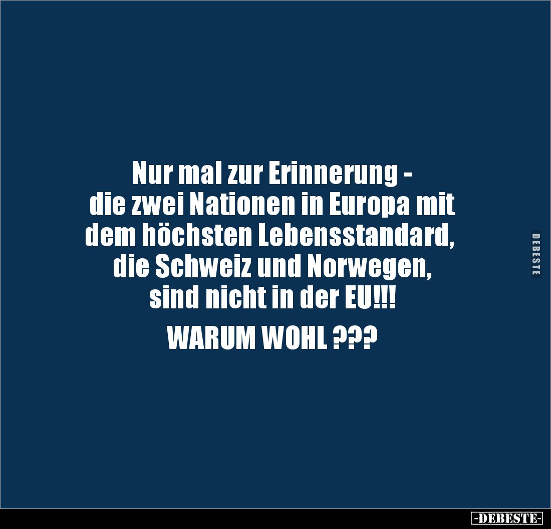 Nur mal zur Erinnerung - die zwei Nationen in Europa mit dem höchsten Lebensstandard, die Schweiz und Norwegen, sind nicht in der EU!!! WARUM WOHL ???