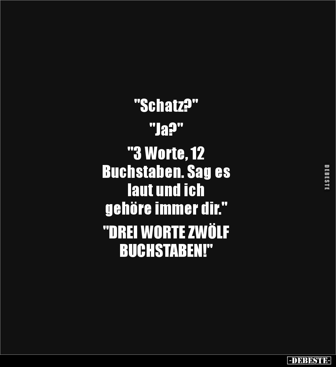 "Schatz?" "Ja?" "3 Worte, 12 Buchstaben. Sag es laut und ich gehöre immer dir." "DREI WORTE ZWÖLF BUCHSTABEN!"