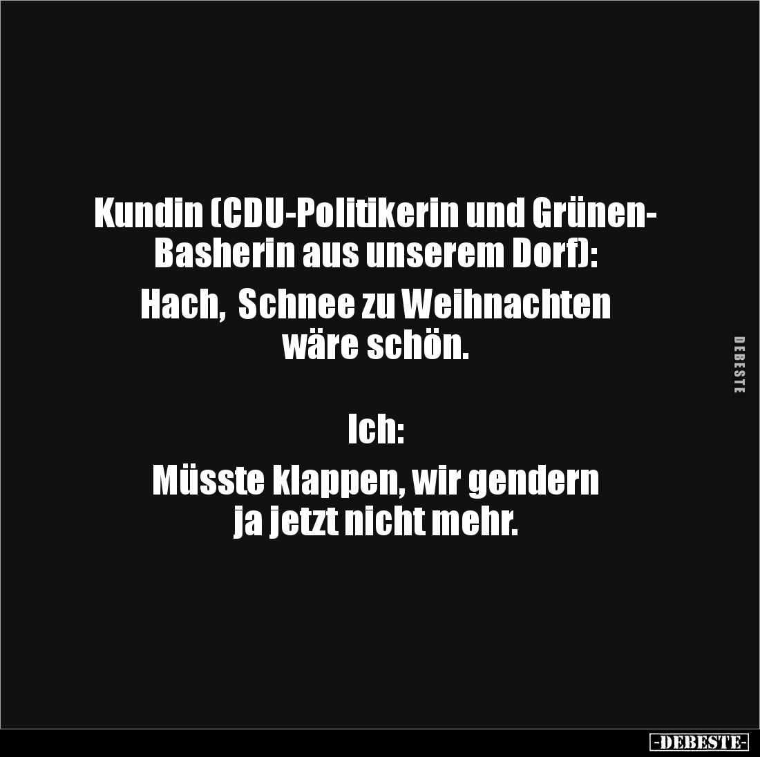 Kundin (CDU-Politikerin und Grünen- Basherin aus unserem Dorf): Hach, Schnee zu Weihnachten wäre schön. Ich: Müsste klappen, wir gendern ja jetzt nicht mehr.