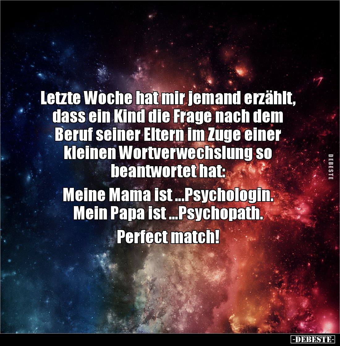 Letzte Woche hat mir jemand erzählt, dass ein Kind die Frage nach dem Beruf seiner Eltern im Zuge einer kleinen Wortverwechslung so beantwortet hat: Meine Mama ist ...Psychologin. Mein Papa ist ...Psychopath. Perfect match!