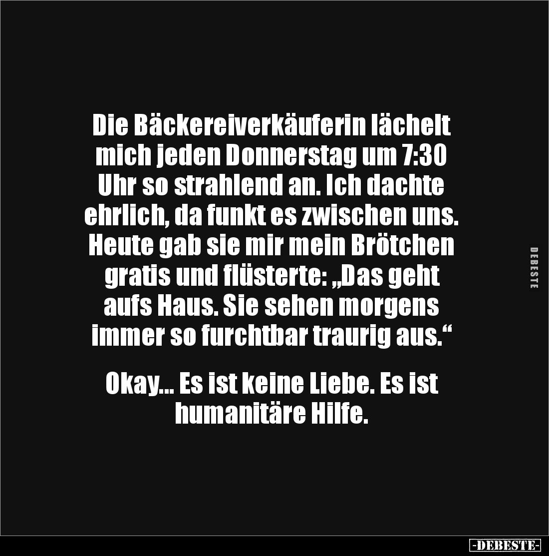 Die Bäckereiverkäuferin lächelt mich jeden Donnerstag um 7:30 Uhr so strahlend an. Ich dachte ehrlich, da funkt es zwischen uns. Heute gab sie mir mein Brötchen gratis und flüsterte: „Das geht aufs Haus. Sie sehen morgens immer so furchtbar traurig aus.“ Okay... Es ist keine Liebe. Es ist humanitäre Hilfe.