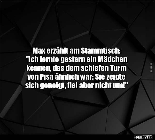 Max erzählt am Stammtisch: "Ich lernte gestern ein Mädchen kennen, das dem schiefen Turm von Pisa ähnlich war: Sie zeigte sich geneigt, fiel aber nicht um!"