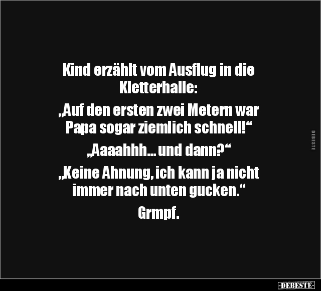Kind erzählt vom Ausflug in die Kletterhalle: „Auf den ersten zwei Metern war Papa sogar ziemlich schnell!“ „Aaaahhh… und dann?“ „Keine Ahnung, ich kann ja nicht immer nach unten gucken.“ Grmpf.
