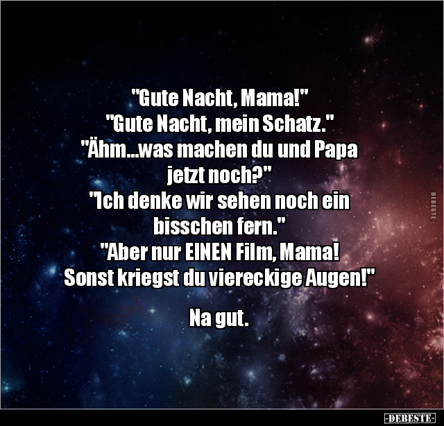 "Gute Nacht, Mama!" "Gute Nacht, mein Schatz." "Ähm...was machen du und Papa jetzt noch?" "Ich denke wir sehen noch ein bisschen fern." "Aber nur EINEN Film, Mama! Sonst kriegst du viereckige Augen!" Na gut.