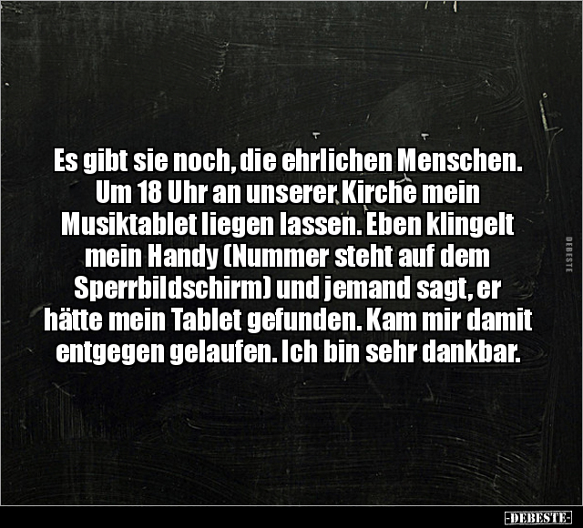 Es gibt sie noch, die ehrlichen Menschen. Um 18 Uhr an unserer Kirche mein Musiktablet liegen lassen. Eben klingelt mein Handy (Nummer steht auf dem Sperrbildschirm) und jemand sagt, er hätte mein Tablet gefunden. Kam mir damit entgegen gelaufen. Ich bin sehr dankbar.