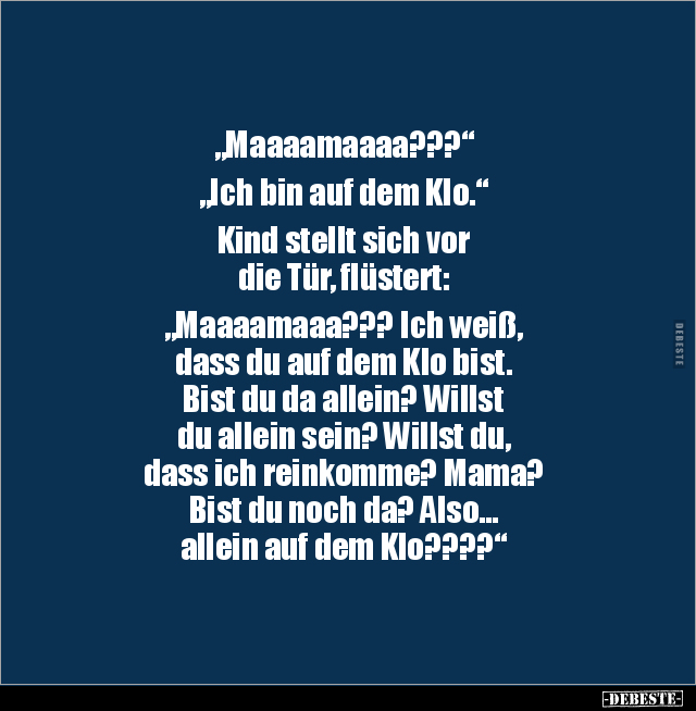 „Maaaamaaaa???“ „Ich bin auf dem Klo.“ Kind stellt sich vor die Tür, flüstert: „Maaaamaaa??? Ich weiß, dass du auf dem Klo bist. Bist du da allein? Willst du allein sein? Willst du, dass ich reinkomme? Mama? Bist du noch da? Also… allein auf dem Klo????“