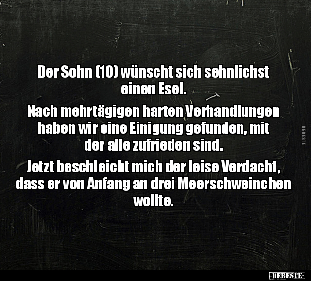 Der Sohn (10) wünscht sich sehnlichst einen Esel. Nach mehrtägigen harten Verhandlungen haben wir eine Einigung gefunden, mit der alle zufrieden sind. Jetzt beschleicht mich der leise Verdacht, dass er von Anfang an drei Meerschweinchen wollte.